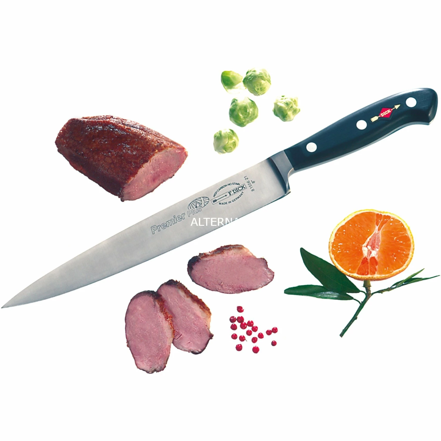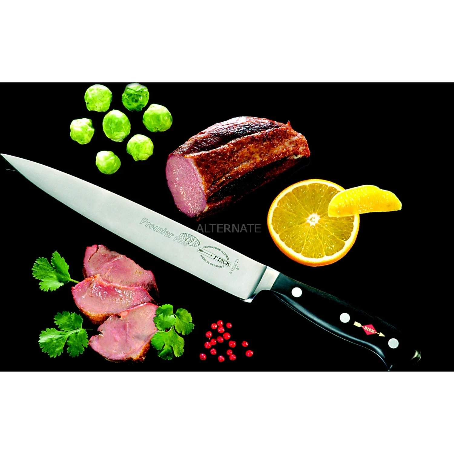 Die glatte Schneide und die dünne Klinge des Premier Plus Tranchiermessers 81456152 schneidet problemlos rohes Fleisch, Braten, Roastbeef oder Schinken in perfekte, dünne Scheiben und reduziert das Auslaufen von wertvollem Bratensaft. Professionelle Köche setzen seit Jahrzehnten auf die Messer der Serie Premier Plus von DICK. Die atemberaubende Schärfe, die perfekte Balance und das klassisch elegante edle Design überzeugen Küchenchefs auf der ganzen Welt. Besonders beim täglichen, langen Arbeiten mit dem Messer sind die Griffform ohne störende Kanten und die ergonomische Form von großer Bedeutung. Mit Liebe zum Detail werden die Messergriffe der Serie Premier Plus in feinster Handarbeit aufwändig abgerundet und liegen daher sehr angenehm in der Hand. Jedem Messergriff wird von erfahrenen Profis mit viel Sorgfalt der letzte Schliff verliehen. Besonders großer Wert auf die einwandfreie, erstklassige Schärfe der Messer gelegt. Die Klinge ist aus der hochwertigen Legierung X50CrMoV15 gefertigt, sie steht für lange Schnitthaltigkeit, Verschleißfestigkeit und höchste Endschärfe. Selbstverständlich sind die Premier Plus Messer absolut hygienisch. Durch das besondere Herstellungsverfahren werden die Griffe spaltenfrei mit der Klinge verbunden, so dass keinerlei Speisereste oder Flüssigkeiten eindringen können.