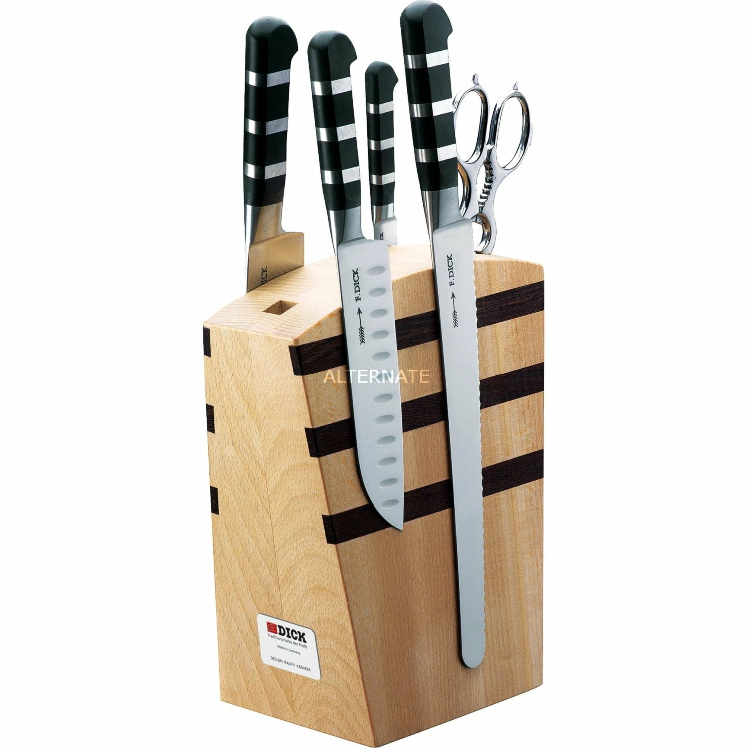 Der elegante Magnet-Messerblock Serie 1905 von DICK ist mit 5 hochwertigen Küchenwerkzeugen bestückt. Das Set 81970000 enthält ein Serie 1905 Officemesser (9cm), das unentbehrliche, vielseitige Werkzeug für Schälarbeiten, kleine Schneidarbeiten und Verzierungen, ein Serie 1905 Kochmesser (21cm) mit spitzer und beidseitig geschliffener Klinge, der Klassiker und das Herzstück der professionellen Küche, ein Serie 1905 Santoku mit dünner Klinge mit keilförmigem Anschliff und Kullenschliff, außerdem ein Serie 1905 Universalmesser mit Wellenschliff (26cm) für Brot oder Obst wie z.B. Melonen, und eine geschmiedete, zerlegbare Küchenschere. Im Jahr 1905 hat Friedr. Dick eine Kochmesserserie mit massiven Zwingen entwickelt, diese ersetzten die bisher üblichen Nieten. Seit damals besticht die Kochmesser-Serie 1905 durch ihre außergewöhnliche Optik. Die ebenmäßigen Stahlringe werden mit einer einzigartigen Technik mit dem Kunststoff untrennbar verbunden. Die Klinge ist aus dem speziellen Edelstahl XCrMoVMn, einem der hochwertigsten deutschen Stähle gefertigt, und der letzte Schliff wird wie schon immer Stück für Stück per Hand angebracht. In Anerkennung der bereits 1905 gefertigten Qualität hat Friedr. Dick die originale Kennzeichnung mit der Marke „F. Dick“ gewählt. Dieses traditionelle Qualitätszeichen wird in Handarbeit geprägt. Mit der Serie 1905 verbinden sich traditionelles Design und moderne Technologie. Die außergewöhnliche Optik der 1905 Messer verbindet sich selbstverständlich mit den heutigen hohen Hygieneansprüchen.