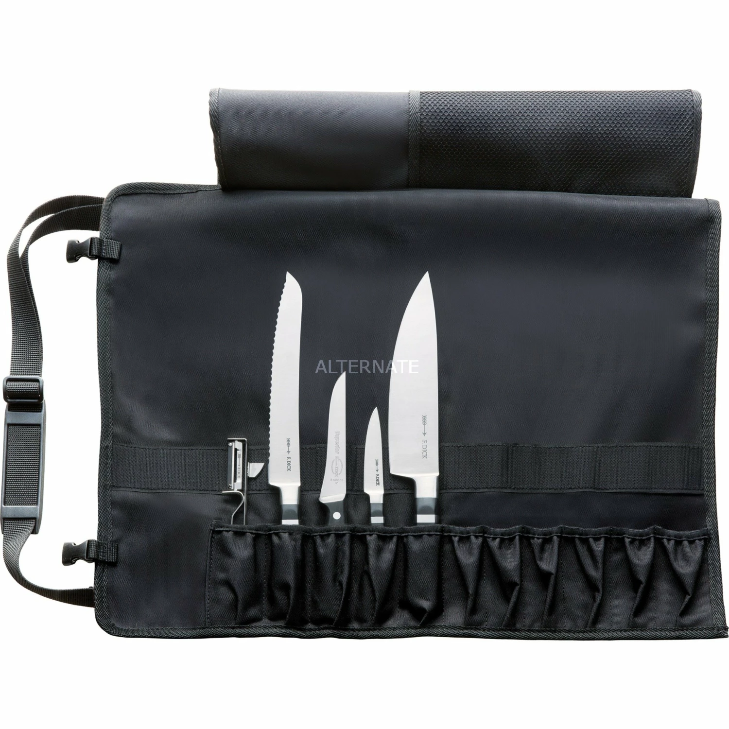 Die robuste Serie 1905 Rolltasche von DICK ist mit fünf hochwertigen Kochwerkzeugen bestückt. Das Set 8199400 enthält ein Serie 1905 Officemesser 81947092, das unentbehrliche, vielseitige Werkzeug für Schälarbeiten, kleine Schneidarbeiten und Verzierungen, ein Serie 1905 Kochmesser 81947212 mit spitzer und beidseitig geschliffener Klinge, der Klassiker und das Herzstück der professionellen Küche, ein flexibles Ausbeinmesser 84368130 (13cm), das sich mit seiner flexiblen Klinge ideal an das Schneidgut anpasst, ein Serie 1905 Brotmesser 81939212 mit zackigem Wellenschliff für alle harten und weichen Brotsorten, oder Obst wie z.B. Melonen, und einen praktischen Pendelschäler. Sechs weitere leere Fächer stehen in der Rolltasche noch zur freien Verfügung. Im Jahr 1905 hat Friedr. Dick eine Kochmesserserie mit massiven Zwingen entwickelt, diese ersetzten die bisher üblichen Nieten. Seit damals besticht die Kochmesser-Serie 1905 durch ihre außergewöhnliche Optik. Die ebenmäßigen Stahlringe werden mit einer einzigartigen Technik mit dem Kunststoff untrennbar verbunden. Die Klinge ist aus dem speziellen Edelstahl XCrMoVMn, einem der hochwertigsten deutschen Stähle gefertigt, und der letzte Schliff wird wie schon immer Stück für Stück per Hand angebracht. In Anerkennung der bereits 1905 gefertigten Qualität hat Friedr. Dick die originale Kennzeichnung mit der Marke „F. Dick“ gewählt. Dieses traditionelle Qualitätszeichen wird in Handarbeit geprägt. Mit der Serie 1905 verbinden sich traditionelles Design und moderne Technologie. Die außergewöhnliche Optik der 1905 Messer verbindet sich selbstverständlich mit den heutigen hohen Hygieneansprüchen.