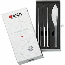 Mit der Serie AJAX Pure Metal bietet F.DICK nun auch Messerkunst für den gedeckten Tisch an. Das AJAX ist ein ganz besonderes Messer, dessen Design auf die 1930er Jahre zurückgeht. Die außergewöhnliche Form erinnert an einen Spalter, ein unverzichtbares Werkzeug für die Fleisch-Verarbeitung. Die auffällige Klingenform mit breitem Klingenblatt und geschwungener Schneide eignet sich ideal zum Verarbeiten von Fleisch und Geflügel. Das Steak- und Tafelmesser AJAX ist das perfekte Messer für alle Grillbegeisterten und Fleischliebhaber, die Wert auf das Besondere legen. Das besonders breite Klingenblatt, die geschwungene, extrem scharfe Schneide des AJAX Pure Metal sorgen für einen sauberen Schnitt ohne Sägen und Reißen. Es genügt ein einmaliges Durchziehen der Klinge, um das Schneidgut zu trennen. Dabei bleibt der Fleischsaft im Fleisch, die Fleischfasern werden nicht zerrissen. Das Steakmesser AJAX Pure Metal hat einen glatten, schlanken Schliff, also keinen Wellenschliff, dieser erlaubt einen sauberen Schnitt durch das Fleisch, egal welche Garstufen dieses hat. Das AJAX Pure Metal kann für alle Lebensmittel eingesetzt werden und wird so zum Alleskönner und Hingucker auf dem gedeckten Tisch. Die einzigartige Griffgestaltung verhindert, dass die Messerklinge beim Ablegen in Kontakt mit der Tischdecke kommt. Eine Messerbank, um das benutzte Messer abzulegen, um den Tisch bzw. die Unterlage nicht zu verunreinigen, wird damit überflüssig.