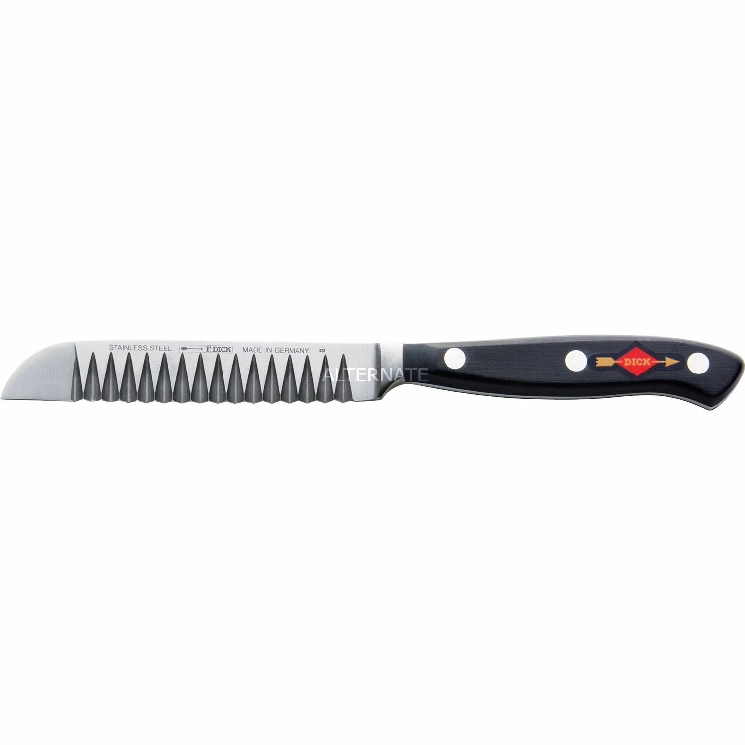 Mit einem Buntschneidemesser, oft auch kurz Buntmesser genannt, schneidet man Gemüse wie Gurken, Möhren oder auch Obst oder Butter und Käse in dekorative „Riffelscheiben“. Das Superior Buntschneidemesser 81450100 von DICK gibt den Beilagen oder Salatzutaten ein appetitliches Aussehen mit filigraner Verzierung. Die Superior-Serie ist für den Einsatz im professionellen, aber auch häuslichen Bereich konzipiert. Das klassische Design mit Griffnieten und die leichte Ausführung ergeben ein Messer, das sicher zu handhaben ist. Mit der Messerserie Superior ist Friedrich Dick eine perfekte Kombination aus einem modernen Messer und einem traditionellen Griffdesign mit drei Nieten gelungen. Das Ergebnis ist ein formvollendeter Klassiker von besonderer Qualität. Die Klinge ist aus der hochwertigen Legierung X50CrMoV15 gefertigt, sie steht für lange Schnitthaltigkeit, Verschleißfestigkeit und eine hohe Korrosionsbeständigkeit. Selbstverständlich sind die Superior Messer absolut hygienisch. Durch das besondere Herstellungsverfahren werden die Griffe spaltenfrei mit der Klinge verbunden, so dass keinerlei Speisereste oder Flüssigkeiten eindringen können.