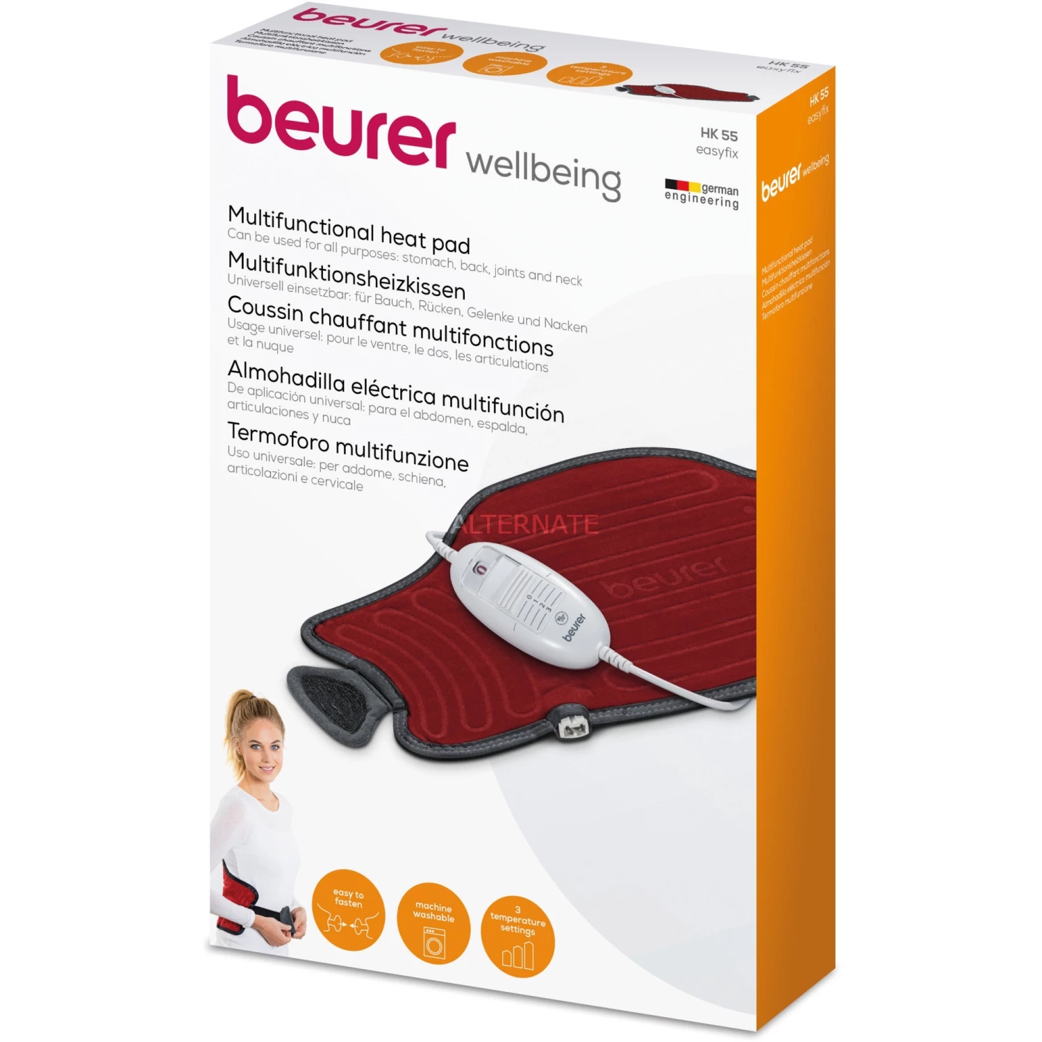 Das Beurer Heizkissen Easy Fix HK 55 ist flexibel einsetzbar durch seine körpergerechte Form. Es eignet sich so für Bauch, Rücken, Gelenke und zusammengerollt auch als Nackenheizkissen. Durch das elastische Verlängerungsband ist es für fast jeden Bauchumfang passend und ist leicht fixierbar. Das Material ist anschmiegsam und hautsympathisch. Das Easy Fix HK 55 verfügt über drei elektronsich einstellbare Temperaturstufen. Zur Sicherheit hat es eine automatische Abschaltung nach ca. 90 Minuten. Die Reinigungs des Easy Fix HK 55 kann bei 30 °C in der Maschine erfolgen, da die Zuleitung abnehmbar ist.