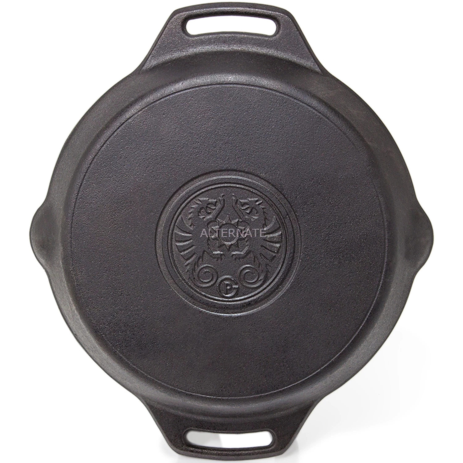 Die gusseiserne Petromax Feuerpfanne fp30 gehört mit ihrer exzellenten Wärmespeicherung zur Ausstattung jeder Küche. Ob in der Draußen-Küche über dem offenen Feuer gekocht wird oder auf dem Herd zuhause, man kann die Feuerpfanne sowohl auf herkömmlichen Herdplatten, auf Gasflammen, im Backofen als auch im Freien auf einer Kochstelle, über einem Lagerfeuer oder auf einem passenden Grill verwenden. Das Gusseisen mit seiner ausgezeichneten Wärmeverteilung und -speicherung ist dank der vorbehandelten Oberfläche (seasoned finish) sofort einsatzbereit und leicht zu pflegen.