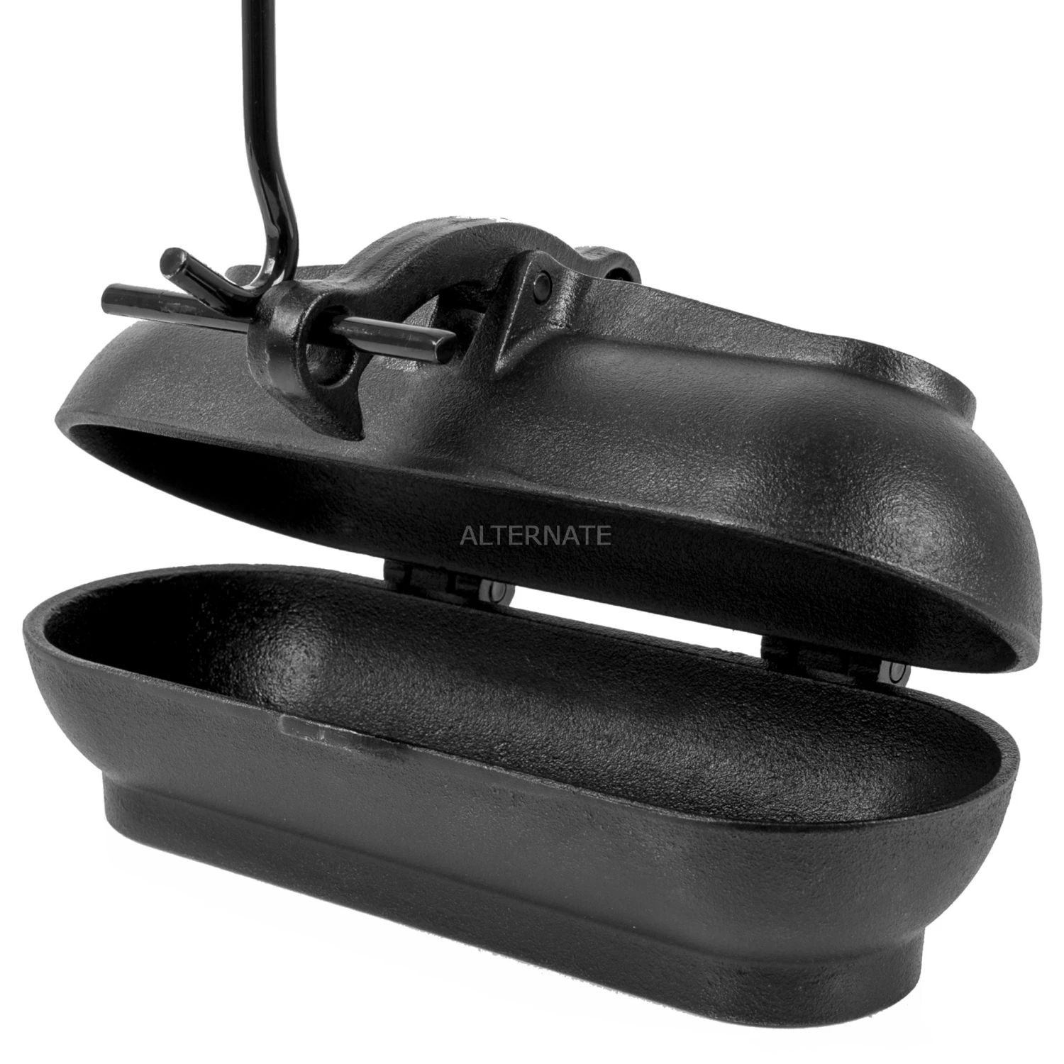 Mit dem gusseisernen Kartoffelbräter werden Kartoffeln und Gemüse direkt mit der Glut gegart. Mit einem Fassungsvermögen von insgesamt 1,8 l finden etwa drei faustgroße Kartoffeln im Inneren Platz. Die Sonderform aus Gusseisen umschließt den Inhalt komplett. Dank der runden Bauform und der ausgezeichneten Materialeigenschaften des Gusseisens wird die Wärme gleichmäßig um den Inhalt verteilt. Dies sorgt für ein ideales Garergebnis, ohne ein Austrocknen der Speisen. Zusätzlich nehmen die Kartoffeln die charakteristischen Röstaromen der Glut auf und liefern ein kräftiges Geschmackserlebnis. Auch mit anderen Speisen, wie Rinderfilet, Geflügelbrust, Süßkartoffelspalten, gefüllten Paprika oder Zucchini, steht der Abwechslung beim Draußen-Kochen nichts im Wege. Der speziell entwickelte Kippriegelmechanismus vereinfacht die Arbeit am Feuer: Mit einem in die obere Öse eingehaktem Deckelheber lässt sich der Kartoffelbräter ganz einfach platzieren oder herausheben. Dabei hält das untere Ende des Kippriegels die Bräter-Hälften fest zusammen und sorgt dafür, dass der Inhalt nicht herausfällt. Wird der Deckelheber an der unteren Öse des Kippriegels angesetzt, so wird die Gussform geöffnet, ohne eine Verbrennung von Fingern oder Händen zu riskieren. Dank des erhöhten Randes lassen sich Glut & Co. auf der Deckeloberseite ablegen und die Oberhitze wird wirkungsvoll genutzt. Der am Boden des Bräters verlaufende Steg bildet eine ebene und sichere Abstellfläche. Damit ist die gusseiserne Sonderform sowohl für das Glutbett, den Grillrost als auch den heimischen Ofen geeignet. Der Steg ist an der Rückseite verlängert, wodurch ein kippsicheres Öffnen des Kartoffelbräters ermöglicht wird.